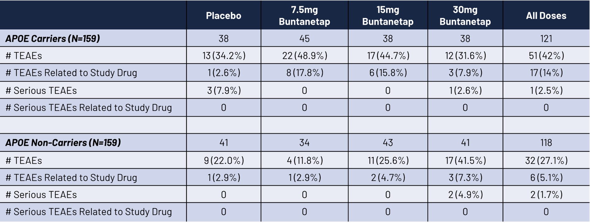 • Patient Breakdown: The study included 159 APOE4 carriers (33 homozygotes and 126 heterozygotes) and 159 APOE4 non-carriers.